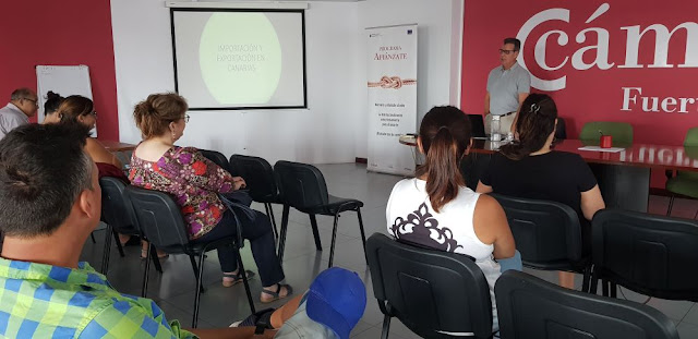Puerto del Rosario Fuerteventura ,16 de octubre de 2019.- Una veintena de personas participó hoy en el taller gratuito “Relaciones con la Agencia Tributaria Canaria y Aduanas en importaciones y exportaciones”. El aduanero y experto Jorge García Pérez ha animado a los presentes a comercializar más allá de las fronteras insulares y ha explicado que “no hay que tener miedo porque no es complicado y se puede importar y exportar desde Canarias sin problemas”.