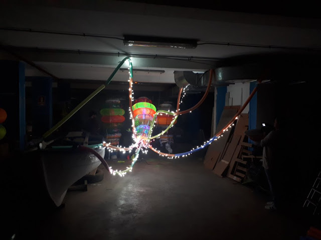 La colaboración y concienciación ciudadana ha sido otra de las claves de este proyecto, tras desarrollarse con los vecinos un taller de elaboración de medusas a partir de botellas de plástico recicladas, y a través de la comunidad escolar, como el grupo de alumnos de segundo de Bachillerato del IES Corralejo que estuvo hoy colaborando en la decoración de las esculturas de los calamares en el taller donde se monta la iluminación.