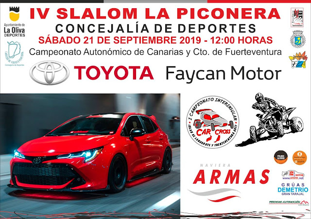 La Oliva, a 17 de septiembre de 2019. Este sábado 21 de septiembre se celebra la cuarta edición del 'Slalom La Piconera - Concejalía de Deportes del Ayuntamiento de La Oliva - Toyota Faycan Motor', prueba automovilística valedera para el XXIII Campeonato de Slaloms de Tierra de Fuerteventura, para el Campeonato Autonómico de Slaloms de Tierra, y para el I Campeonato Insular de Quads.
