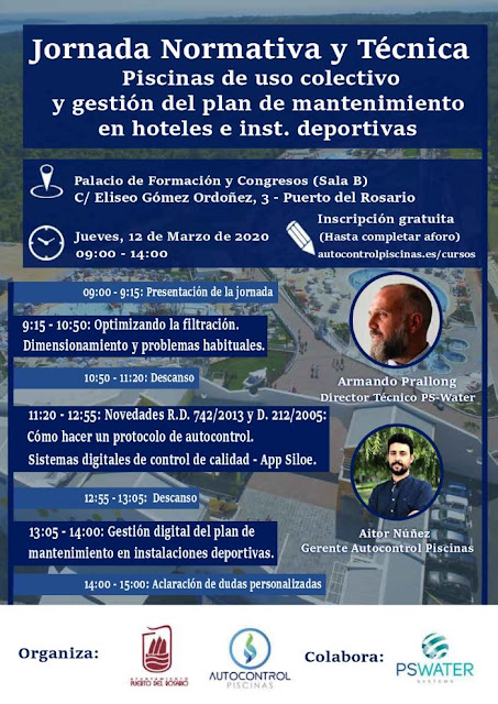 El Ayuntamiento de Puerto del Rosario, la consultora Autocontrol Piscinas y la empresa PS-Water, organizan el jueves 12 de Marzo una jornada formativa para responsables de hoteles e instalaciones deportivas en el municipio de Puerto del Rosario.