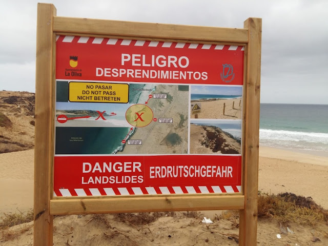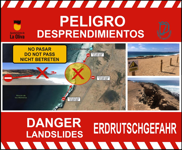La Oliva, Fuerteventura a 30 de julio de 2018. El Ayuntamiento de La Oliva continúa trabajando en la mejora de la seguridad y los servicios en el litoral del municipio, en esta ocasión con la instalación esta mañana de nueva señalización informando en varios idiomas sobre el peligro de desprendimientos en el acantilado situado al sur de Piedra Playa.