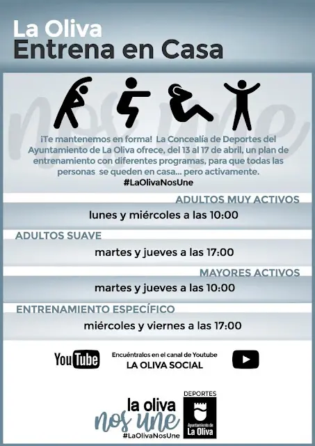 La Oliva, a 13 de abril de 2020. El Ayuntamiento de La Oliva invita a la población a participar en el nuevo programa "La Oliva Entrena en Casa", una iniciativa para hacer ejercicio de manera fácil y sencilla mientras continúe el confinamiento.