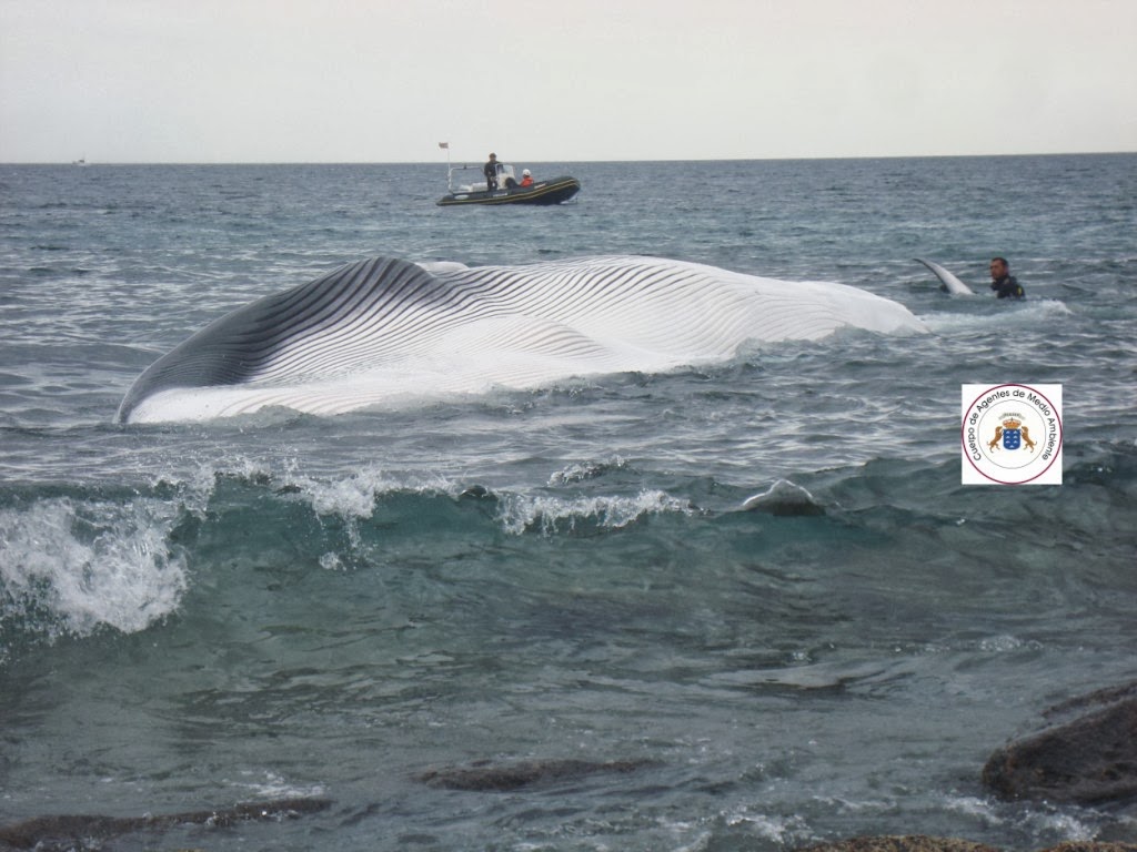 el cetáceo es un ejemplar adulto de rorcual común (Balaenoptera physalus), sin signos externos aparentes de daños y