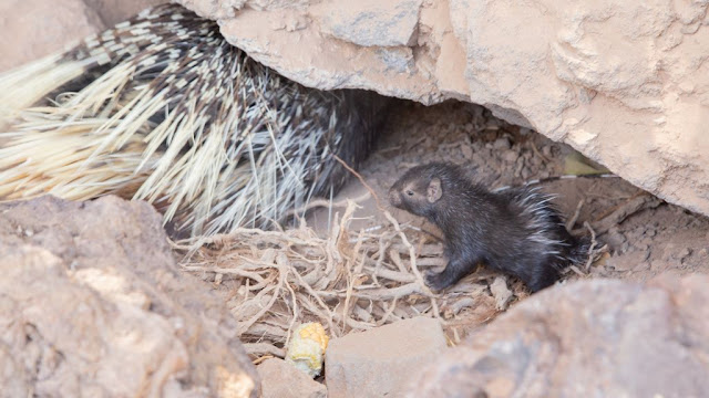 Días antes de su nacimiento, la madre estuvo excavando un nido para su llegada. Los puercoespines hembra tienen entre una y cuatro crías por camada. Las crías tienen púas suaves al nacer, que se endurecen a los pocos días, y a partir de los dos meses de edad, los pequeños ya se independizarán de sus padres.
