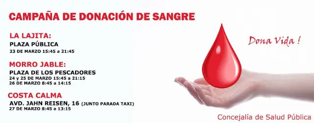 La unidad móvil de donación de sangre estará, en La Lajita, el lunes 23 de marzo, en concreto en la Plaza Pública, desde las 15:45 hasta las 21:15 horas.
