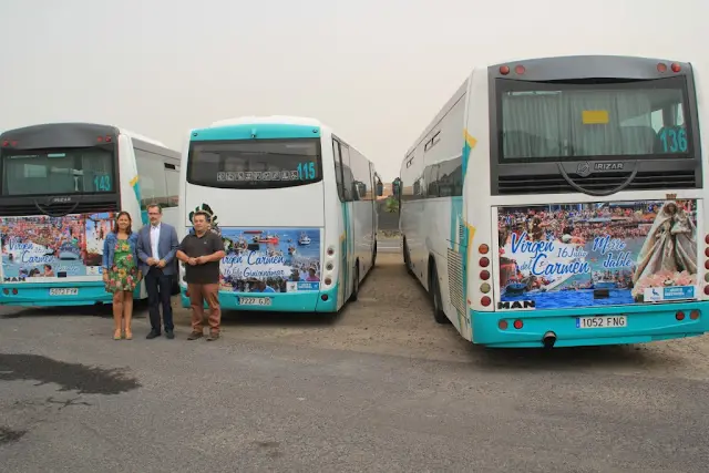 la parte trasera de tres guaguas con imágenes de las fiestas que se