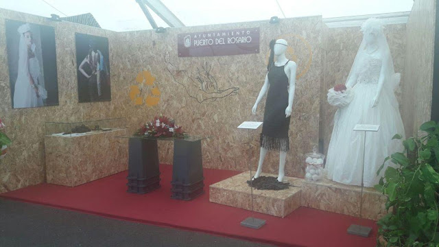 trajes, ambos realizados con bolsas de plástico. El traje de novia, “Boda plástica” realizado con bolsas de