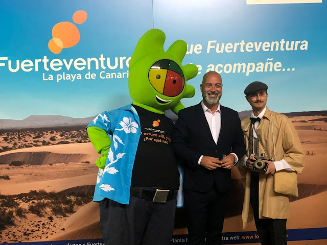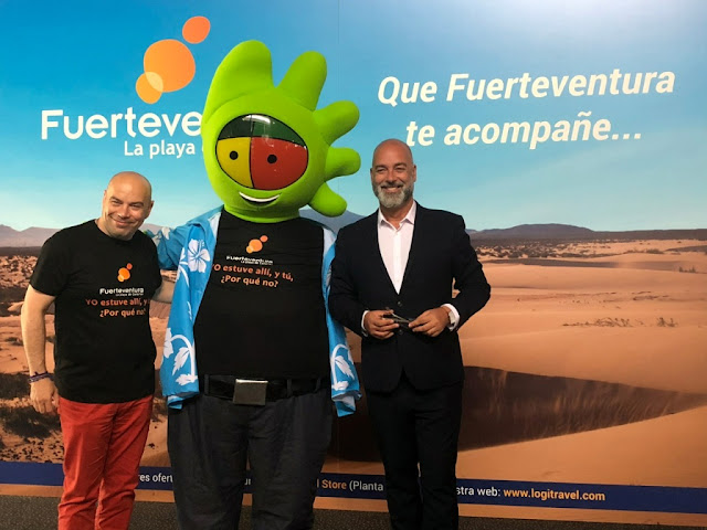 Set de Fuerteventura con mascota de Logitravel ( Logi ) y Director General de Marketing de Logitravel ( Carlos García )