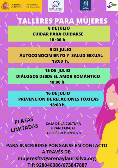 La iniciativa tiene como objetivo sensibilizar en materia de prevención de la violencia de género y el empoderamiento de mujeres del municipio de Tuineje. Los cuatro talleres son: cuidar para cuidarse, el día 8 de julio; autoconocimiento y salud sexual, el 9 de julio; diálogos desde el amor romántico, el miércoles 15 de julio; y prevención de relaciones tóxicas, el 16 de julio. Todos los talleres serán a las 18:00 horas en la Casa de la Cultura de Gran Tarajal.