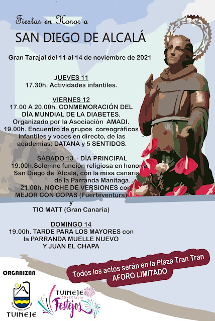 El sábado 13 se celebra el día principal de las fiestas con la solemne función religiosa en honor a San Diego de Alcalá con la misa canaria de la Parranda Manitaga a partir de las 19:00 horas.