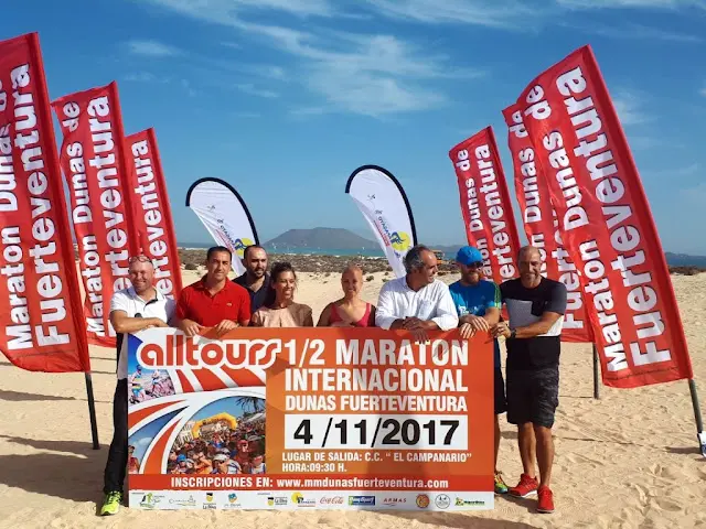 lugar la 'IX Alltours ½ Maratón Internacional Dunas Fuerteventura.Esta mañana se presentó a los medios una media maratón única en Europa en cuanto a su recorrido, al discurrir por un paraje desértico como es el Parque Natural de las Dunas de Corralejo, singular en cuanto a su proyección turística, pues congrega a 16 nacionalidades entre los 500 corredores inscritos, y reconocida por su máximo respeto al entorno medioambiental, tanto desde la organización como de los propios corredores.