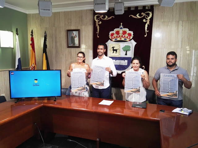 El acalde de La Oliva, Isaí Blanco, y la concejala de Festejos, Guacimara González, dieron a conocer el programa acompañados de algunos representantes de los colectivos vecinales colaboradores, Esther Santana, conocida por todos como "Zaragoza", en representación del Comité de Vecinos del Casco viejo de Corralejo, y Patricio Martín como portavoz de la Comisión de Fiestas.