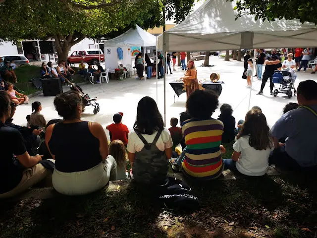 - Numerosas familias disfrutaron este fin de semana de exhibiciones de Salto del Palo, silbo canario, cuenta cuentos o maguadas, lucha y conciertos en la plaza de Antigua desde la mañana hasta el anochecer.