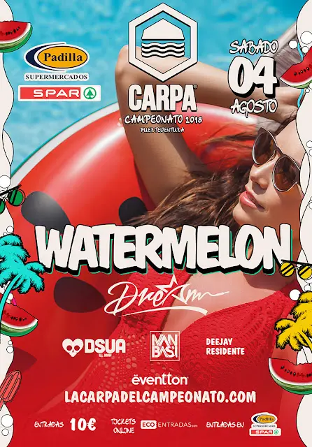 Con la noche del sábado llega la fiesta más refrescante y esperada, la Closing party 2018 ‘watermelon’, una cita que nadie se quiere perder para despedir una nueva edición de La Carpa de Fuerteventura. para hacer vibrar a todos los afortunados que consigan su entrada, se subirán al escenario los deejays Dsua Ill Man, DJ Dream, Ivan&Basi, y el Dj Residente.