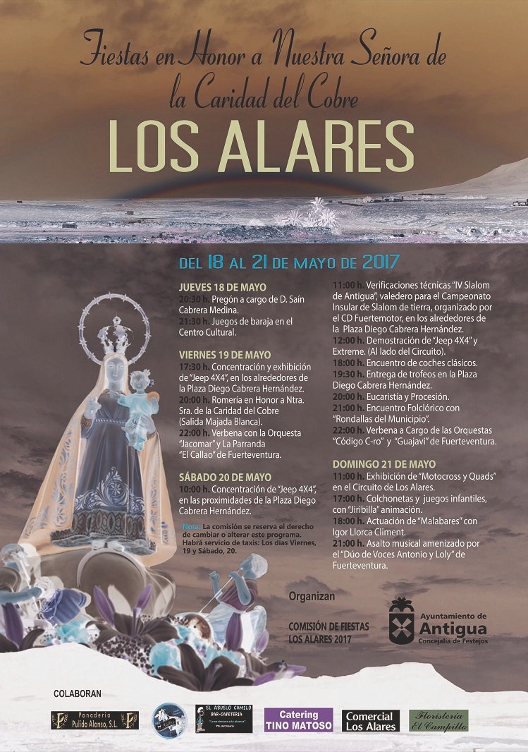 Un amplio programa de festejos coordinado por la Comisión de Fiestas y la concejalía de Festejos del Ayuntamiento de Antigua, en el que cobra un protagonismo especial el mundo del motor con la celebración del IV Slalom de Antigua, la Exhibición de Motocross y Quads en el Circuito de Los Alares, una demostración de Jeep 4x4 y Extreme, y el Encuentro de Coches Clásicos.