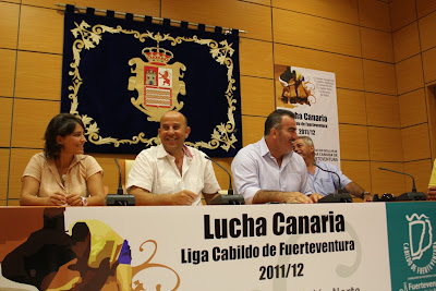 El consejero de Deportes, Antonio Mesa, estuvo acompañado en la presentación por el presidente de la Federación Insular de Lucha Canaria de Fuerteventura, Rafael Rodríguez, y por concejales del área de varios ayuntamientos y presidentes de clubes.