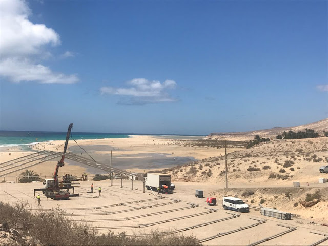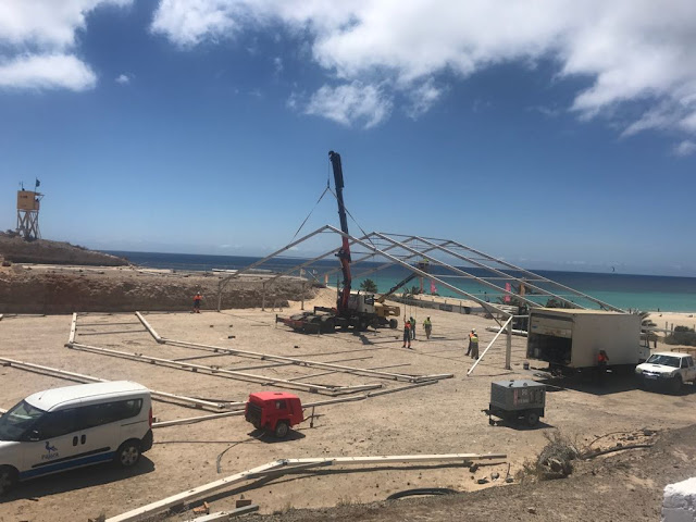 La Concejalía de Obras Municipales del Ayuntamiento de Pájara, que dirige Alexis Alonso, completa estos días en Playa de la Barca la instalación de las carpas de actividades del Campeonato del Mundo de Windsurfing y Kiteboarding de Fuerteventura 2018.