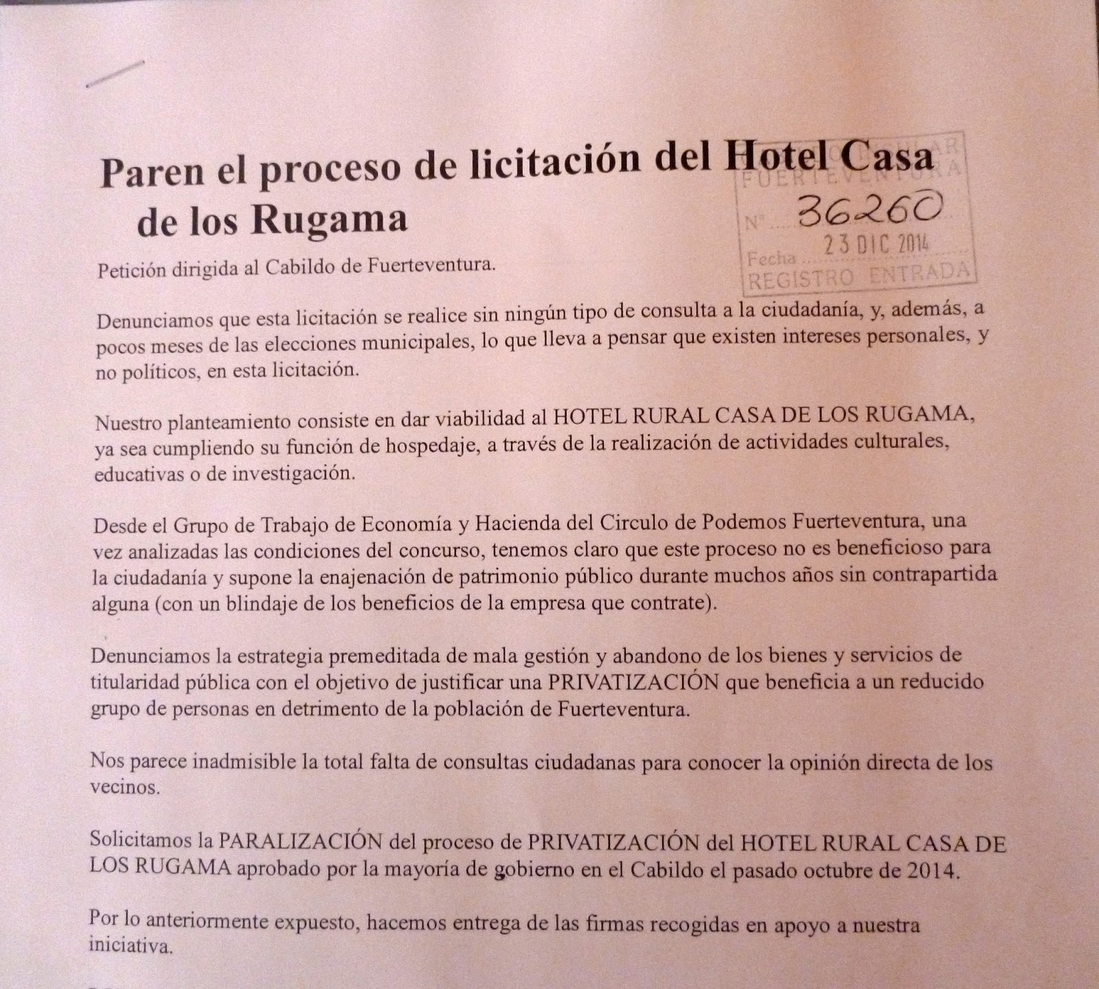 El Círculo de Podemos Fuerteventura declara inadmisible la total falta de consulta ciudadana para conocer la opinión directa de las vecinas y vecinos. Solicitan, por tanto, la paralización del proceso de privatización del Hotel Rural Casa De Los Rugama, aprobado por la mayoría de gobierno en el Cabildo el pasado octubre de 2014.