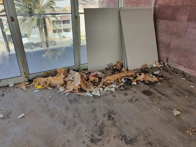 cafetería están abiertas, con cristales rotos, quemada, destrozada. Absoluto