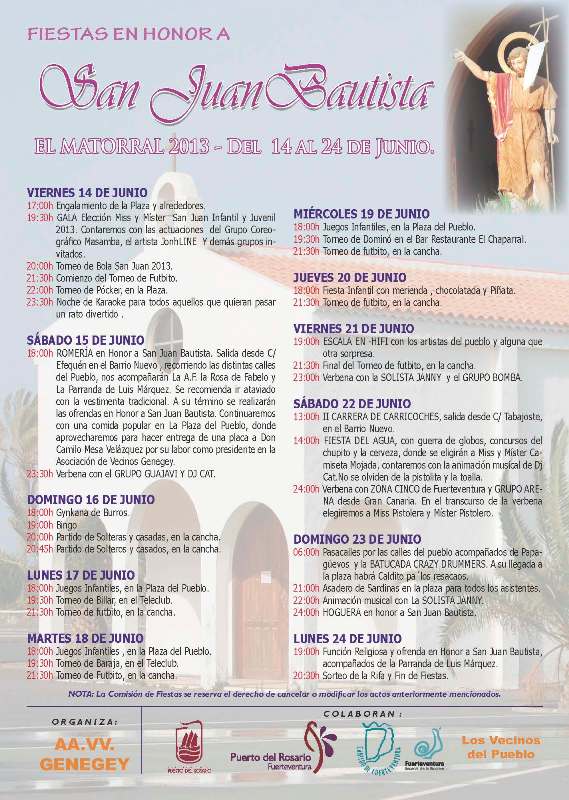 Sebastian Martin 11/jun/13 - 17:21 Siguiente chevron_right Las Fiestas de San Juan 2013, se celebrarán del 14 al 24 de Junio Programa de la Fiestas de San Juan 2013 en el Matorral Sebastian Martin Etiquetas Sin categoría Siguiente chevron_right
