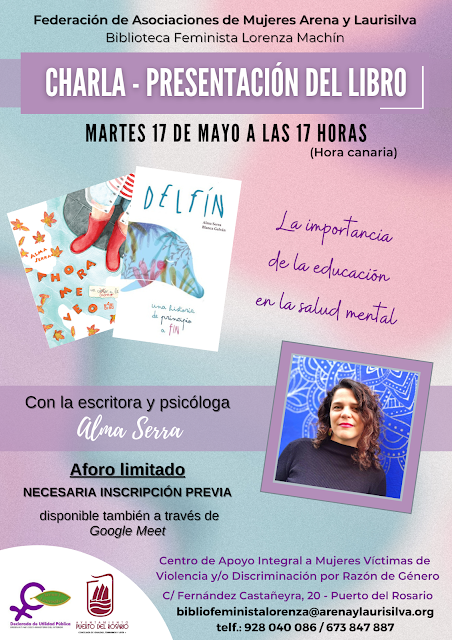 El próximo martes 17 de mayo a las 17:00h (hora canaria) con la Charla – Presentación online de la escritora y psicóloga Alma Serra autora de” Ahora me veo” y “Delfín”.