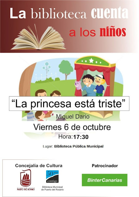 • Este viernes, 6 de octubre, a las 17:30h, tendrá lugar una nueva convocatoria con los Cuentacuentos para niños. En esta ocasión será con la obra “La Princesa es triste” de Miguel Darío.