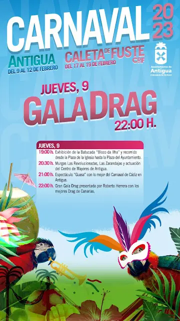 El Ayuntamiento de Antigua desde la concejalía de Festejos presenta los Carnavales de Antigua 2023, inaugurando el escenario de las carnestolendas del Caribe con el espectáculo de murgas a las 20:30 horas de Las Revolucionadas, Las Zarandajas y el Centro de Mayores de Antigua.
