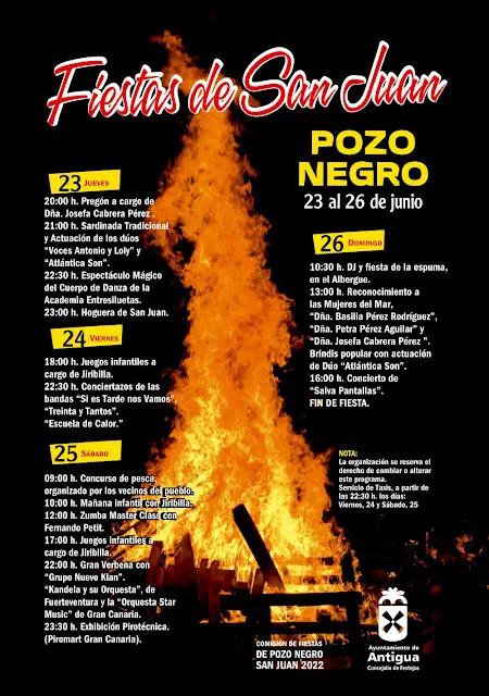 El cartel de las Fiestas de Pozo Negro ofrece un fin de semana completo de pop, rock, verbena de orquestas, exhibición pirotécnica, fiestas del agua y concurso de pesca infantil, y añade el concejal, si el jueves disfrutamos de la sardinada tradicional y las actuaciones de los dúos de Antonio y Loly y Atlántica Son, el viernes por la tarde, juegos infantiles con Jiribilla y los conciertazos de la Bandas Si es Tarde nos Vamos, Treinta y Tantos y Escuela de Calor.