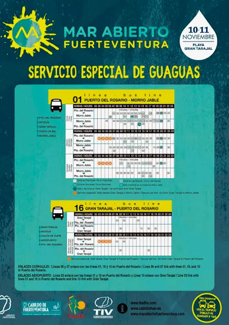 La línea 16, con salida de Gran Tarajal en dirección a Puerto del Rosario: en la madrugada del sábado se establecerán servicios especiales a las 03.00, 04.00, 05.00 y 06.00 horas. Estos servicios saldrán de Gran Tarajal a Puerto del Rosario.
