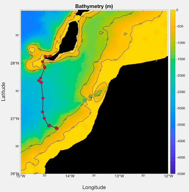 La tortuga Chofe, que fue liberada hace una semana en Cofete con un dispositivo de seguimiento satelital, se encuentra ya en la costa del África subsahariana. Una zona en la que existe afloramiento marino rico en nutrientes.