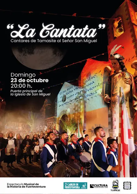 El entorno de la Iglesia de San Miguel de Arcángel de Tuineje acogerá este domingo, 23 de octubre, el espectáculo musical conocido como ‘La Cantata, Cantares de Tamasite al Señor San Miguel’. El evento dará comienzo a las 20.00 horas en la puerta principal del templo, dentro del programa de las Fiestas Juradas en honor a San Miguel Arcángel.