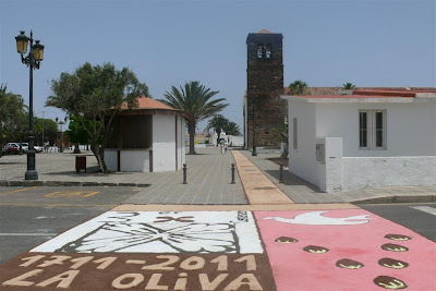 Una alfombra de sal que cubría el camino desde la Parroquia de Nuestra Señora de La Candelaria hasta el Ayuntamiento de La Oliva dio la bienvenida a la fiesta del Corpus Christi, que este año vino respaldada por las celebraciones del tricentenario de la creación de la parroquia, que se vieron reflejadas en la alfombra. Precisamente, este mismo recorrido fue el que realizó la procesión del Corpus este domingo.