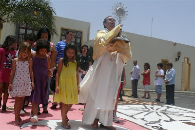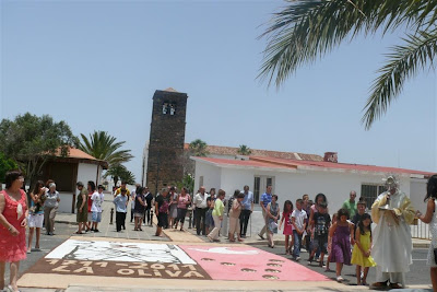Al finalizar la misa cantada, el párroco sacó en procesión una Custodia fechada en el siglo XVII, que se conserva como un tesoro en la iglesia de La Oliva, y que según cuenta el arcediano de Fuerteventura, José Lavandera, “posiblemente fue adquirida para la constitución de la parroquia en 1711, igual que ocurrió en la parroquia de Pájara”.