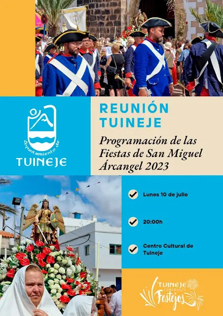 Tuineje, 10 de julio de 2023. – El Ayuntamiento de Tuineje organiza una reunión para la programación de las próximas fiestas de San Miguel Arcángel 2023 en Tuineje, hoy, lunes 10 de julio en el Centro Cultural de la localidad, a las 20:00 horas.